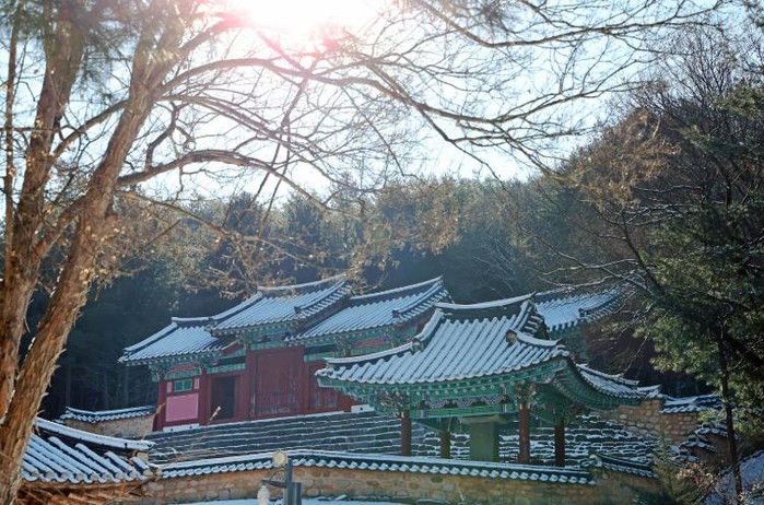 | ▲ 눈이 내린 뒤 해가 비치는 순간, 괴산군 청천면 화양서원의 기와지붕 위로 얹힌 눈이 서원의 윤곽을 선명하게 한다 |