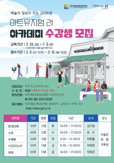 [파이낸셜경제=김기보 기자] 여주세종문화관광재단 아트뮤지엄 려에서 2026년 3월 6일 ~ 3월 15일 동안 아트뮤지엄 려 아카데미 강좌 수강생을 모집한다고 밝혔다.