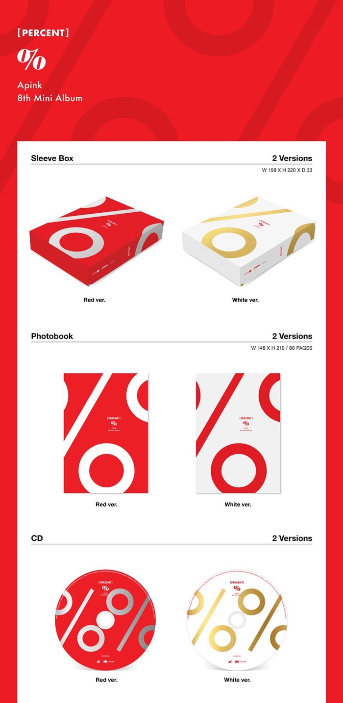 미니 8집 ‘PERCENT’는 숫자를 나타내는 단위인 퍼센트에 어떠한 숫자를 붙이지 않고 오롯이 사용해 무한한 에이핑크의 가능성을 보여준다는 의미를 담은 음반으로, ‘PINK’ 타이틀을 과감히 버리며 변화를 시도했던 미니 7집 ‘ONE & SIX(원 앤 식스)’와 이어지며 음악적 성장을 담아내 더욱 기대를 모은다.