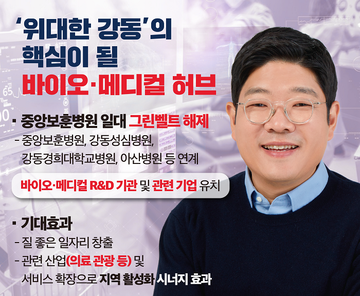아울러 강동에는 의료자원이 많으며 관내에 중앙보훈병원, 강동성심병원, 강동경희대학교병원과 인근에 아산병원도 있다고 설명했다. 또한 이러한 시설들과 연계해 바이오·메디컬 R&D 기관 및 관련 기업을 유치하겠다는 것이 그 구상이며, 질 좋은 일자리와 다른 산업·서비스로의 확장과 시너지 효과를 기대할 수 있을 것이라고 분석했다.