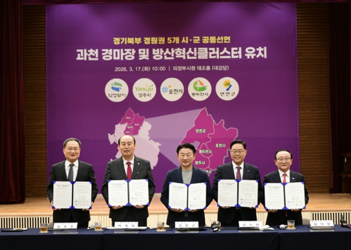 [파이낸셜경제=김예빈 기자] 포천시는 17일 의정부시청 태조홀에서 경기북부 경원권 5개 시군(포천·의정부·양주·동두천·연천)과 함께 ‘과천경마공원 이전 및 방산혁신클러스터 유치’를 위한 공동선언식을 개최했다.