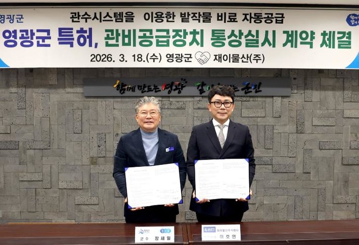 [파이낸셜경제=김예빈 기자] 영광군은 지난 18일 전북 군산시에 위치한 재이물산(주)과 ‘관비공급장치’ 특허에 대한 통상실시권 계약을 체결했다고 밝혔다.