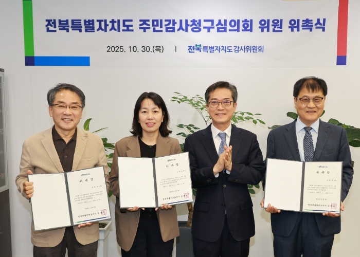 [파이낸셜경제=김예빈 기자] 전북특별자치도는 공정하고 투명한 행정 실현을 위해 주민감사청구심의회 민간 위원 4명을 위촉했다고 30일 밝혔다.