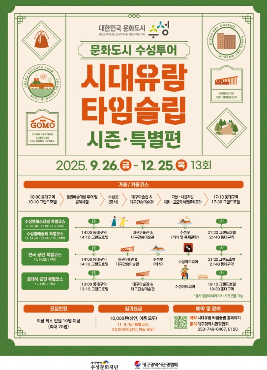 첫째, '시대유람 타임슬립 : 시즌·특별편' 투어는 지난 7월 진행된 '시대유람 타임슬립 : 여름편'의 후속으로, 수성구의 계절별 특색을 살려 가을편과 겨울편으로 나누어 운영된다.