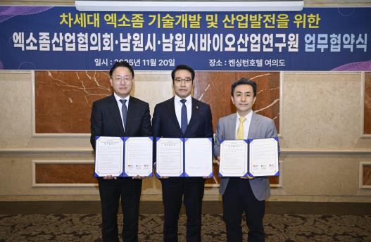 [파이낸셜경제=김예빈 기자] 남원시는 2025년 11월 20일 켄싱턴호텔 여의도에서 차세대 바이오소재 엑소좀 기술개발 및 산업발전을 위한 엑소좀산업협의회-남원시-남원시바이오산업연구원과 업무협약을 체결했다.