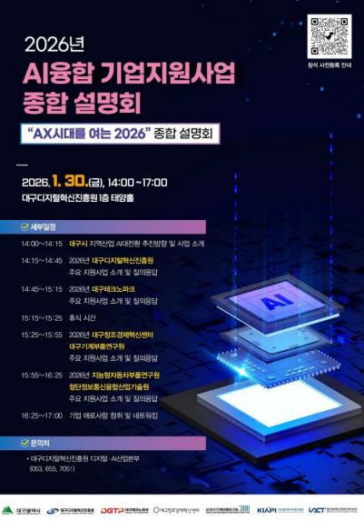 [파이낸셜경제=김지훈 기자] 대구광역시는 1월 30일 오후 2시, 대구디지털혁신진흥원(DIP) 1층 태양홀에서 지역 AI융합 기업지원기관 7개 기관이 공동으로 ‘2026년 AI융합 기업지원사업 종합설명회’를 개최한다.