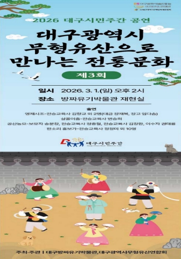 [파이낸셜경제=김지훈 기자] 대구문화예술진흥원 박물관운영본부 소속 대구방짜유기박물관에서는 2026년 대구시민주간(2.21.~28.)을 맞아 3월 1일 오후 2시, 박물관 재현실에서 대구의 전통문화를 알리는 특별 공연 ‘대구광역시 무형유산으로 만나는 전통문화’를 개최한다.