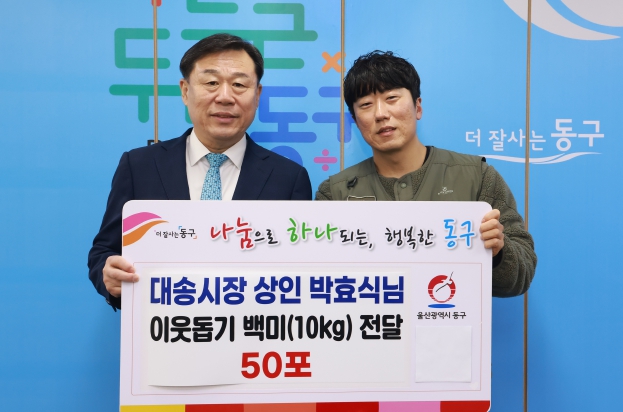 [파이낸셜경제=김예빈 기자] 울산 동구 대송시장에서 식품유통업체를 운영하고 있는 new캐슬장터 박효식 대표가 1월 28일 오전 11시 10분 동구청을 방문해 시가 200만원 상당의 쌀(10kg) 50포를 전달했다.