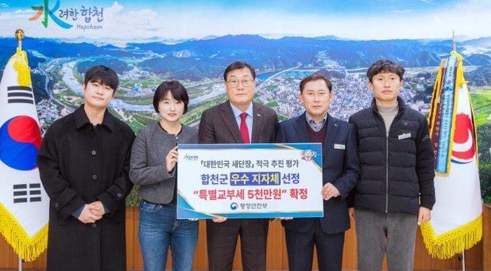 [파이낸셜경제=김예빈 기자] 합천군은 행정안전부가 주관한 ‘대한민국 새단장’ 평가에서 우수 지자체로 선정돼 특별교부세 5천만 원을 확보했다고 6일 밝혔다.