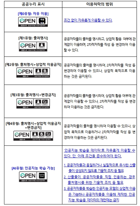 아울러, 기존 공공누리 유형(제1~4유형)의 이용조건은 유지하면서 인공지능(AI) 학습 목적으로는 공공저작물을 자유롭게 활용할 수 있는 ‘인공지능(AI)유형’도 새롭게 마련했다. 기존에 상업적 이용이나 변경 이용이 허용되지 않는 공공저작물이라도 ‘인공지능(AI)유형’을 기존 공공누리 유형과 함께 표시할 경우, 인공지능(AI) 학습에는 자유롭게 활용할 수 있다는 점에서 인공지능(AI) 분야의 활성화를 위해 개방할 수 있는 공공저작물의 범위가 크게 확대될 전망이다.