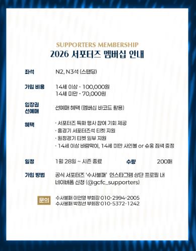 먼저 멤버십 회원은 김천상무 홈경기 시 선수들과 가장 가까운 곳에서 응원의 열기를 느낄 수 있는 서포터즈석(N2, N3구역) 입장권을 정액 7천 원에 구매할 수 있다.