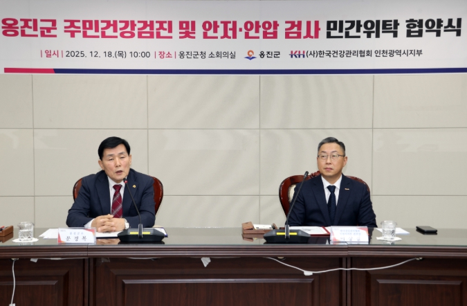 [파이낸셜경제=김기보 기자] 옹진군은 12월 18일 한국건강관리협회 인천광역시지부와 ‘옹진군 주민 건강검진 및 안저·안압 검사 위·수탁 협약’을 체결하고, 주민 대상 종합건강검진 사업을 본격 추진한다.