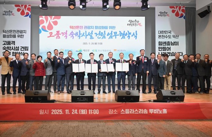 예산군수는 “이번 협약을 계기로 덕산온천관광지의 체류형 관광 기반이 한층 강화될 것으로 기대한다”며 “고품격 숙박 및 컨벤션 인프라 구축을 통해 예산 및 충남 지역의 관광환경을 개선하고 지역 경제활성화에 크게 기여할 것으로 확신한다”고 밝혔다.
