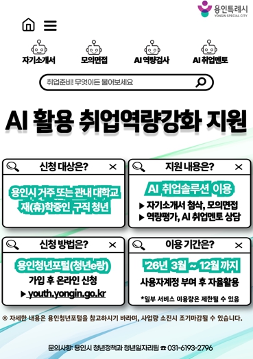 [파이낸셜경제=김기보 기자] 용인특례시는 인공지능(AI)을 활용한 취업역량강화 지원사업에 참여할 청년 구직자를 모집한다고 2일 밝혔다.