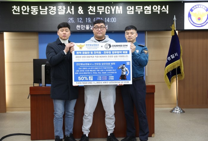 [파이낸셜경제=김영란 기자] 천안 동남경찰서(서장 송해영)는 2025년 12월 19일(금) 오후 2시, 천안동남경찰서 중회의실에서 무에타이·MMA 전문 체육관인 ‘천무짐’(관장 문보람)과 ‘경찰관 체력 증진 및 복지 향상’을 위한 업무협약(MOU)을 체결했다고 밝혔다.