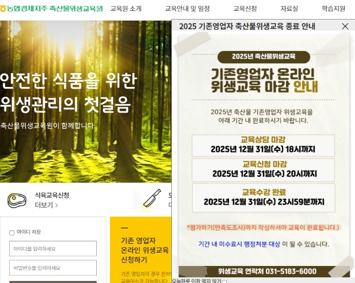 올해 정기 의무 위생교육은 축산물기업중앙회, 축산물위생교육원, 한국식품안전협회 홈페이지를 통해 온라인으로 12월 31일까지 이수 가능하다.