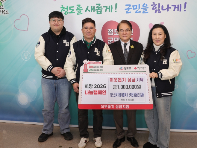 조형석 과대표는 “추운 겨울을 보내고 있는 이웃들에게 우리의 작은 정성이 위로와 희망이 되길 바라며, 앞으로도 청도의 성장과 발맞추어 지역사회와 상생하는 학과로써 지속적인 나눔을 실천하겠다”고 말했다.
