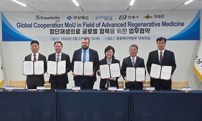 [파이낸셜경제=김지훈 기자] 안동시는 경상북도, 포항시, 의성군과 함께 2월 27일 환동해지역본부(동부청사) 9층 대회의실에서 독일 프라운호퍼 IBMT 연구소와 ‘첨단재생의료산업 육성을 위한 업무협약 (MOU)’을 체결했다.