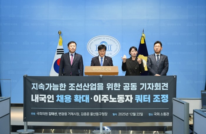 [파이낸셜경제=김영란 기자] 변광용 거제시장은 지난 22일 김태선 국회의원(울산동구, 환경노동위), 김종훈 울산 동구청장과 함께 국회 소통관에서 기자회견을 열고, ‘조선산업기본법’ 제정, 내국인 채용 확대, 외국인 쿼터 축소를 골자로 한 고용구조 전환의 필요성을 정부에 촉구했다.