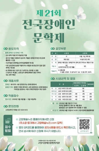 [파이낸셜경제=김기보 기자] 고양시장애인종합복지관은 3월 19일까지 전국의 장애인 및 장애인 가족을 대상으로 ‘제21회 전국장애인문학제’ 작품 접수를 진행한다.