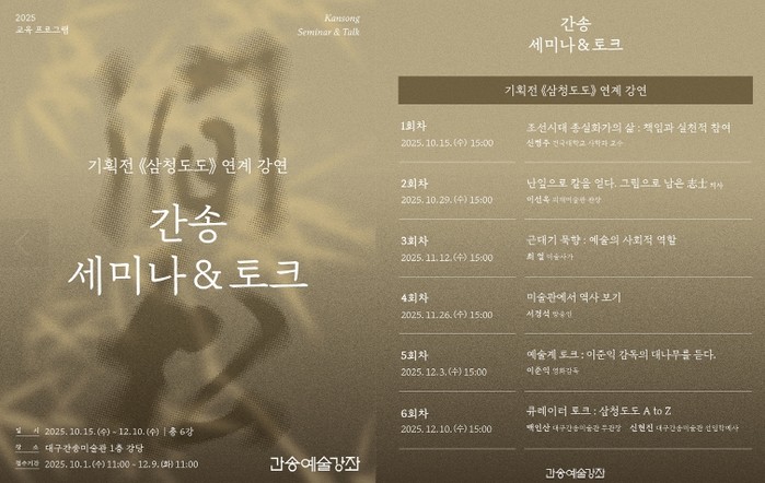 [파이낸셜경제=김지훈 기자] 대구간송미술관은 광복 80주년 기념 기획전 《삼청도도 – 매·죽·난, 멈추지 않는 이야기》와 연계하여 ‘간송예술강좌: 세미나 · 토크’를 운영한다.