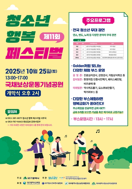 [파이낸셜경제=김지훈 기자] 대구광역시는 10월 25일 오후 2시, 국채보상운동기념공원에서 ‘2025년 제11회 청소년 행복 페스티벌’을 개최한다.