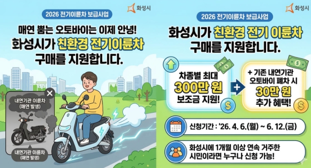 [파이낸셜경제=김기보 기자] 화성특례시가 온실가스 감축과 대기환경 개선을 위해 2026년도 상반기 전기 이륜차 보급 사업 신청자 모집을 한다고 25일 밝혔다.