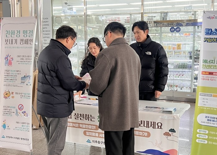 [파이낸셜경제=김기보 기자] 인천 미추홀구는 11일 주안역 일대에서 구민들을 대상으로‘친환경 설 명절 보내기 운동(캠페인)’을 실시했다.