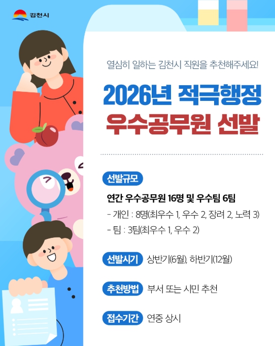 [파이낸셜경제=김지훈 기자] 김천시는 행정서비스 향상과 공익 증진, 사회문제 해결을 위해 2026년도 적극행정 우수공무원을 선발한다고 밝혔다.