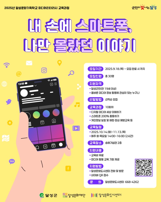 [파이낸셜경제=김지훈 기자] (재)달성문화재단 달성문화도시센터는 10월 14일부터 11월 13일까지 선비체험관(송해기념관) 2층에서 ‘미디어리터러시 교육과정 – 내 손에 스마트폰, 나만 몰랐던 이야기’를 진행한다.
