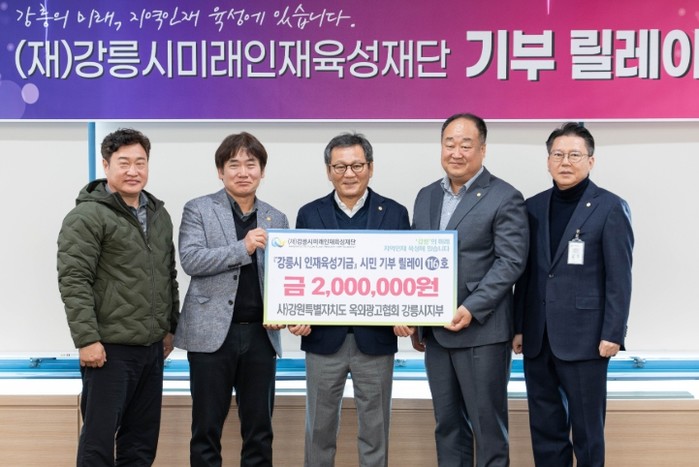 [파이낸셜경제=조성환 기자] (재)강릉시미래인재육성재단은 25일, 신한은행 강원영동본부(본부장 김창범)가 5백만 원, 사)강원특별자치도 옥외광고협회 강릉시지부(지부장 심정호)가 2백만 원을 기탁했다고 밝혔다.