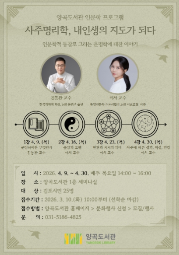 [파이낸셜경제=김기보 기자] 김포시 양곡도서관은 오는 4월 9일부터 4월 30일까지 매주 목요일, 인문학 강좌 '사주명리학, 내 인생의 지도가 되다'를 운영한다.