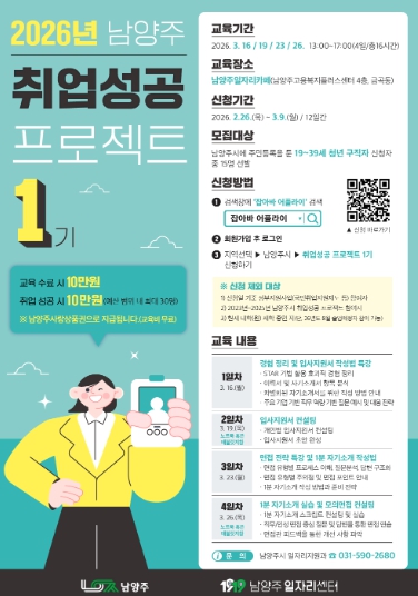 [파이낸셜경제=김기보 기자] 남양주시는 오는 26일부터 청년 구직자의 취업 경잭력 강화를 위해 ‘2026 취업성공 프로젝트 1기’참여자를 모집한다고 밝혔다.