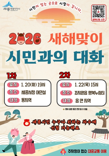 [파이낸셜경제=김영란 기자] 최민호 세종특별자치시장이 2026년 새해를 맞아 시민들의 목소리에 귀를 기울이고 시정 운영방향을 공유하기 위해 ‘새해맞이 시민과의 대화’를 개최한다.