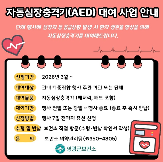[파이낸셜경제=김예빈 기자] 영광군은 오는 3월부터 다중이 모이는 행사에서 발생할 수 있는 심정지 등 응급상황에 대비하기 위해 자동심장충격기(AED) 대여 사업을 추진한다고 밝혔다.