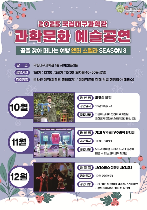 또한 시즌3 문화예술 정기공연으로 10월 18일 ‘씨앗의 비밀’ 마술 공연, 11월 15일 ‘가자! 우주로!’ 우주과학 뮤지컬, 12월 20일 ‘크리스마스 선물이 사라졌다’ 가족 뮤지컬을 국립대구과학관 사이언트리홀에서 개최한다.