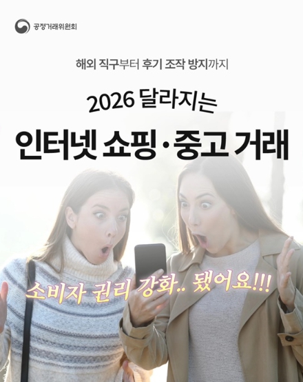 | ▲ ■ 인터넷 쇼핑을 마주한 우리들의 고민 (피해해결) 사업자 없는 판매자와 중고 거래, 믿어도 돼? (사용후기) 이 후기들, 조작된 건 아닐까? (해외직구) 해외 직구, 배송·결제 문제 생기면? (중고거래) 쇼핑몰 피해, 개별로 해결하기엔… ■ 2026년에는 걱정 없이 구매할 수 있어요. - 사업자도 없는데 중고거래, 믿어도 돼? → 분쟁 발생 시, 중개 플랫폼에 개인 판매자의 정보와 거래내역을 법원 등에 제공하도록 하는 의무가 부여돼요. - 해외 직구, 배송·결제 문제 생기면 어떡해? → 해외 사업자도 소비자 불만·분쟁을 처리하도록 국내 대리인 지정이 의무화돼요. ■ 2026년에는 거래 후 고민도 줄어들어요. - 이 후기들… 혹시 조작된 거 아니야? → 사용 후기 수집·처리 기준을 투명하게 공개하도록 의무화해요. - 여러 명이 당했어도, 나는 혼자 해결해야 해? → 소비자 피해를 신속하고 효과적으로 구제하기 위해 동의의결제를 도입해요. 함께 성장하는 공정한 시장 환경 조성을 위한 더 많은 소식과 정보는 공정거래위원회를 팔로우하고 알아보세요. [출처] 대한민국 정책브리핑(www.korea.kr) |