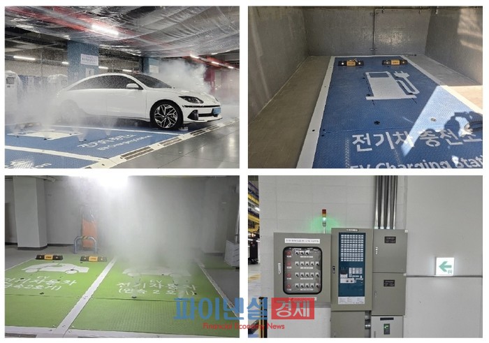 전기차 화재 확산방지 시스템은 전기차 화재 발생시 불꽃감지기, 바닥의 열(온도)감지기로 즉각 감지하고, 이후 자동으로 차량 하부 8개 소화수 냉각 노즐과 측면 부채꼴 형태 노즐에서 분당 240L의 물이 3kgf/cm2 이상의 높은 압력으로 방출돼 화재를 빠르게 진화하는 시스템이다. 시스템 작동은 ▲1단계 화재감지(열(온도)감지) ▲2단계 불꽃감지 ▲3단계 화재 알림 ▲4단계 1차 밸브개방 ▲5단계 2차밸브개방(밸브자동개방) ▲6단계 8개 노즐방사 등 총 6단계로 2분 이내에 신속하게 이뤄진다.