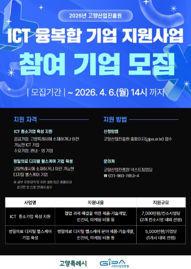 [파이낸셜경제=김기보 기자] 고양산업진흥원이 ‘2026 고양 ICT 융복합 지원사업’ 참여 기업을 모집한다.