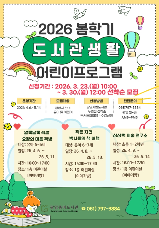 [파이낸셜경제=김예빈 기자] 광양중마도서관은 오는 4월 6일부터 5월 14일까지 6주간 유아(5~7세)와 초등학교 1~2학년을 대상으로 봄 학기 어린이 프로그램에 참여할 수강생을 모집한다고 밝혔다.
