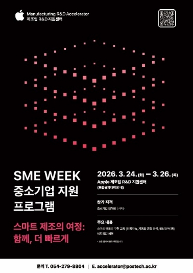 [파이낸셜경제=김지훈 기자] 포항시와 애플 제조업 R·D 지원센터(포항공과대학교 내)는 지역 제조업의 디지털 혁신을 가속화하고 중소기업의 스마트 제조 역량 강화를 위해 내달 24일부터 26일까지 3일간 ‘SME Week 중소기업 지원 프로그램’을 개최한다.