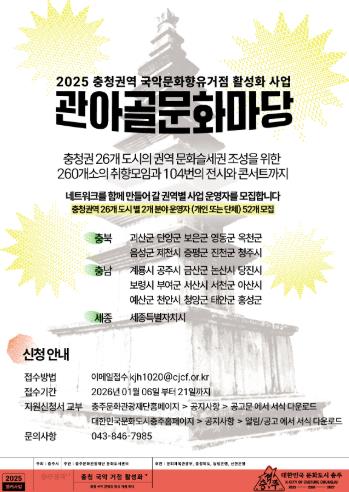 [파이낸셜경제=김기보 기자] 충주문화관광재단과 충주시는 정부의 지방시대 핵심 비전인 ‘5극 3특(5대 초광역권 및 3대 특별자치도)’ 전략에 발맞춰, 충청권역의 문화적 연대를 강화하고 지역 균형 성장을 견인할 '충청권 국악문화향유거점 활성화 사업' 운영자를 오는 21일까지 공개 모집한다.
