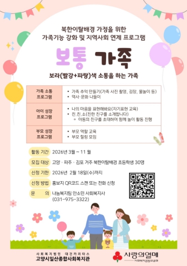 [파이낸셜경제=김기보 기자] 고양시일산종합사회복지관이 북한이탈배경 가정의 가족기능 강화 및 지역사회 통합 프로그램 ‘보통 가족’의 참여자를 이달 18일까지 모집한다.