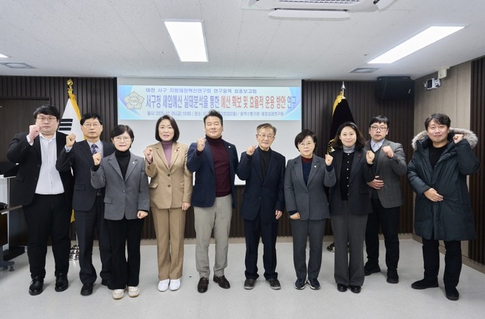 이번 연구는 (사)재정성과연구원이 수행했으며, 대전 서구의 세입 구조와 관리 실태를 종합적으로 분석해 재정자립도 제고와 지속가능한 재정운영을 위한 정책 대안을 마련하기 위해 추진됐으며, 지방재정혁신연구회 소속 의원과 연구진, 관계 공무원 등이 참석해 연구 결과를 공유하고 정책 반영 방안을 논의했다.