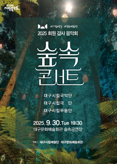 [파이낸셜경제=김지훈 기자] 대구문화예술회관·대구시립예술단 2025 회원 감사 음악회 ‘숲속 콘서트’ 공연이 9월 30일 저녁 7시 30분 대구문화예술회관 숲속 공연장에서 펼쳐진다.