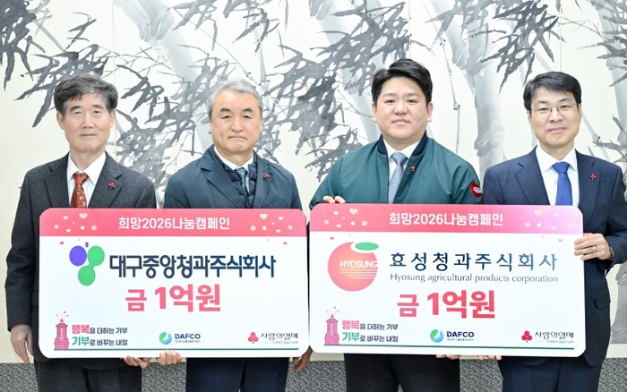 이상윤 대구중앙청과 대표와 김형수 효성청과 대표는 “추운 겨울을 보내고 있는 이웃들에게 조금이나마 보탬이 되길 바란다”며, “앞으로도 단순한 농산물 유통을 넘어 따뜻한 온기를 전하는 상생의 파트너로서 역할을 다하겠다”고 말했다.