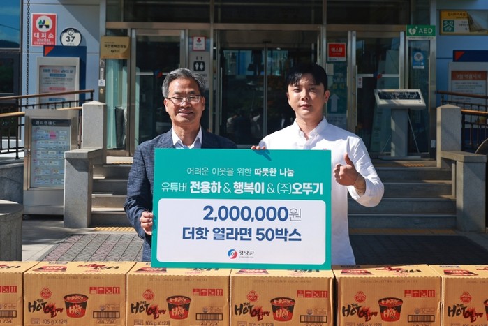 전용하 씨는 최근 행정안전부-㈜오뚜기-영양고추유통공사 간 협업으로 출시된 ‘THE HOT 열라면’ 홍보 활동을 통해 지역 특산품인 영양고추의 우수성을 널리 알리고 있으며, 이번 성금 기탁은 구독자들과 함께한 나눔의 일환으로 마련된 것이다.
