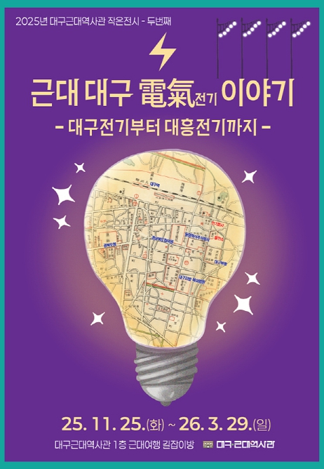 [파이낸셜경제=김지훈 기자] ( 재)대구문화예술진흥원 박물관운영본부 소속 대구근대역사관은 전기(電氣)로 근대 대구사회의 일면을 살펴보는 ‘근대 대구 電氣전기 이야기 –대구전기부터 대흥전기까지-’ 작은전시를 11월 25일부터 2026년 3월 29일까지 1층 대구 근대여행 길잡이방에서 개최한다.