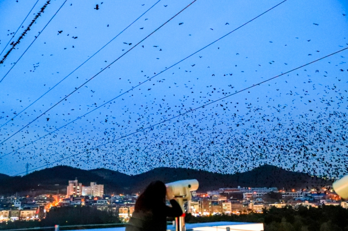 매년 10월 말부터 이듬해 3월까지 울산에 머무는 떼까마귀는 해가 저물 무렵 도심 상공을 뒤덮는 집단 군무를 선보이며 장관을 선사한다.