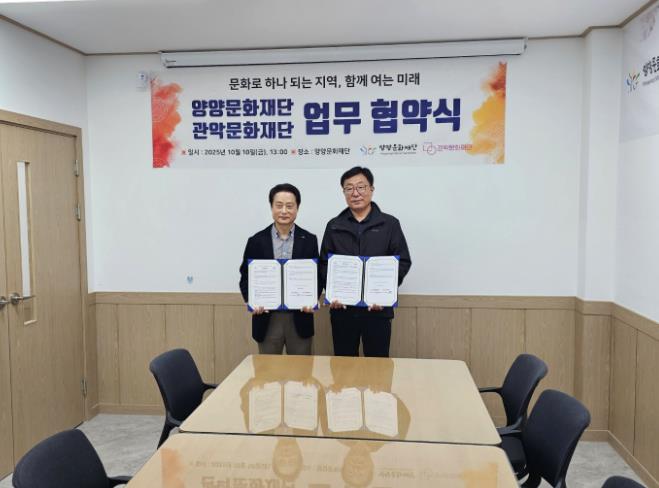 이날 양양문화재단에서 협약식이 열린 가운데, 양양문화재단과 관악문화재단은 지역 주민의 문화 향유 확대를 위해 다양한 협력 사업을 추진하고 지역 문화예술 발전에 기여할 것으로 다짐했다.